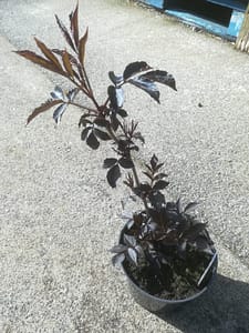Purple Elderberry – £6.50 Shiny dark purple leaves and bunches of white flowers followed by black berries. Highly ornamental and edible too